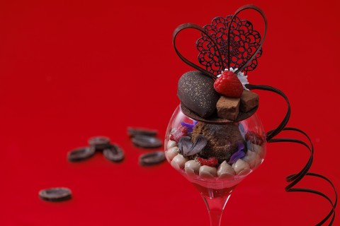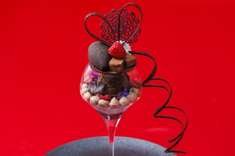 An elegant and gorgeous chocolate parfait adorned with a large ribbon. Features chocolate ice cream, ganache, crunchy chocolate, and an accent of refreshing berry tartness.