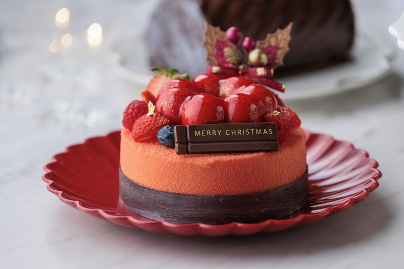 ベイクドチーズとレアチーズの2層仕立て。橙のショコラでコーティングし、サブレ生地で食感を加え、苺、木苺、カシスを赤いジュレで覆ったベリーいっぱいのケーキ。