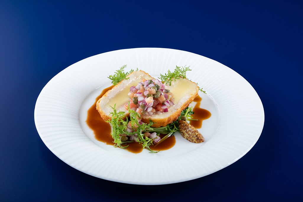 薄く叩いた胸肉に、チーズとハムを挟んで揚げ、酸味の効いたラヴィゴットソースでさっぱりとお召し上がりいただけます。