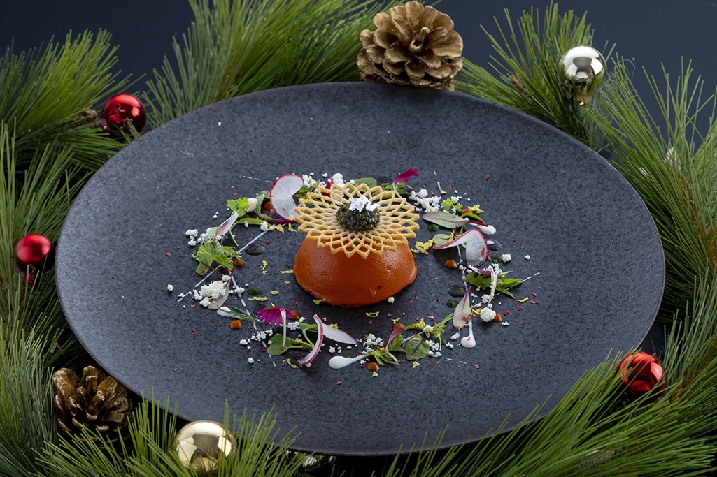 ・オマールディーヌのショーフロワソースを纏ったオマール・ブルーとホタテ貝のマリネ ドーム仕立て