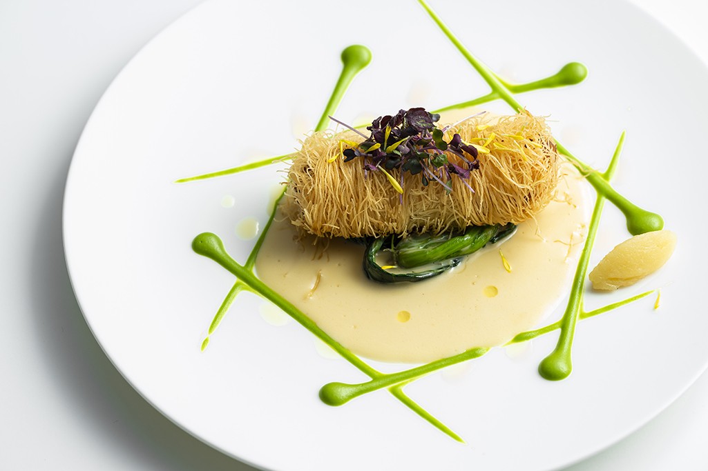 真鯛とホタテ貝のムースを、細い面状の生地で巻いてサクッと揚げ、さっぱりとしたバターソースと塩レモンをアクセントにしました。