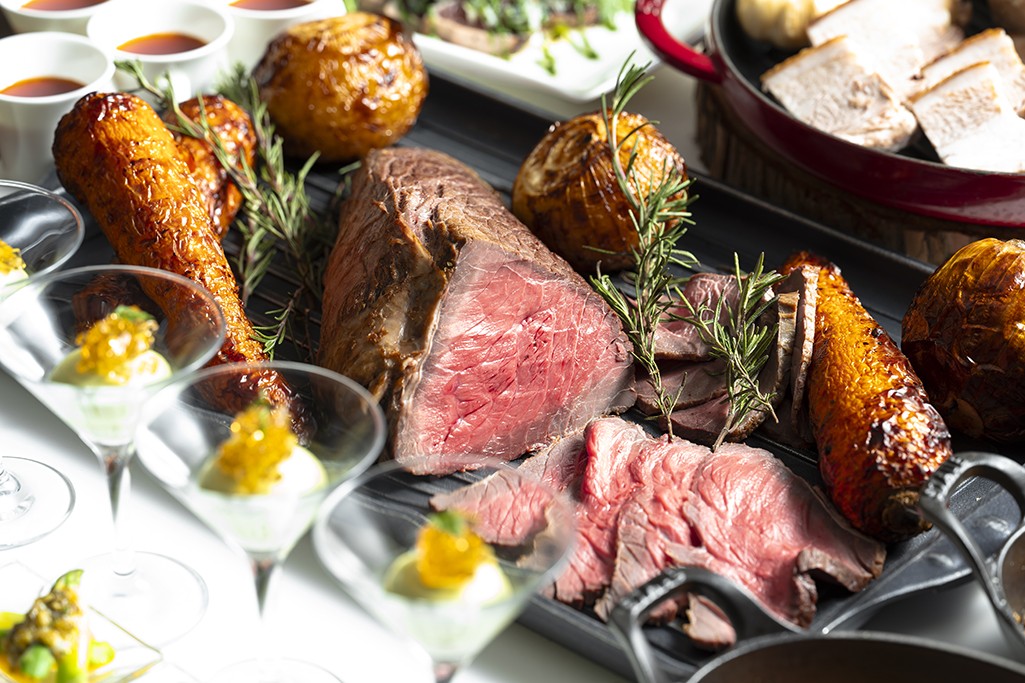 前菜やサラダ、人気のローストビーフ、温かい料理、デザート各種、バラエティー豊かな料理を約50品、ブッフェ形式でご用意いたします。